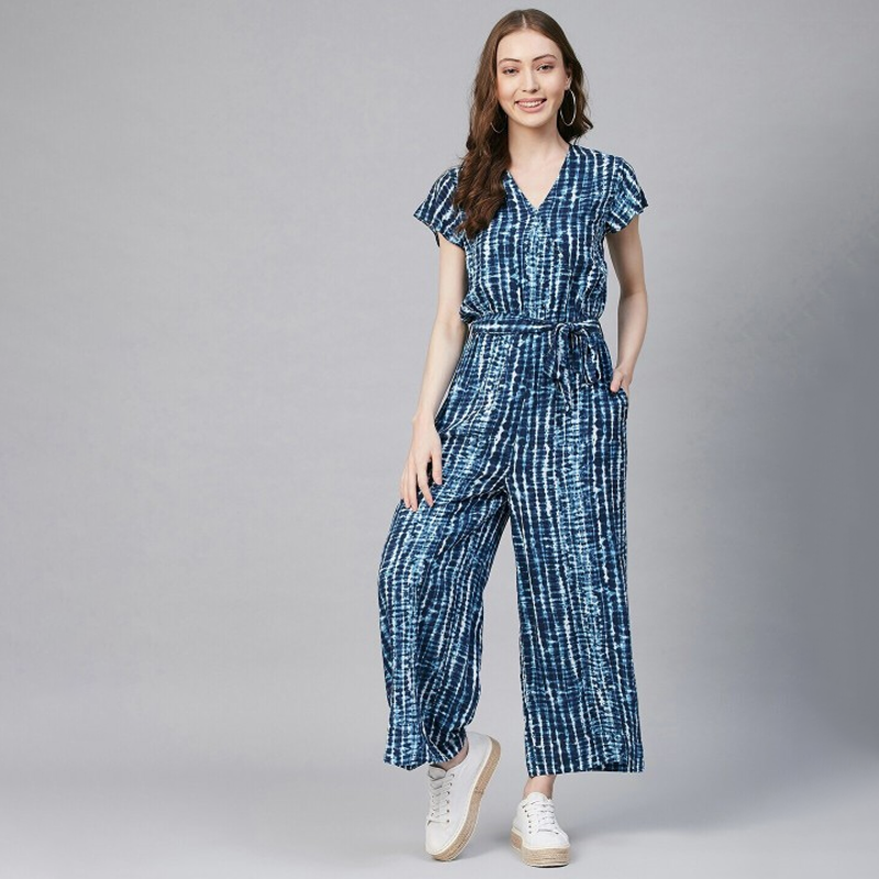 Tie-Dye Printed V-Neck Short Sleeves Basic Jumpsuit