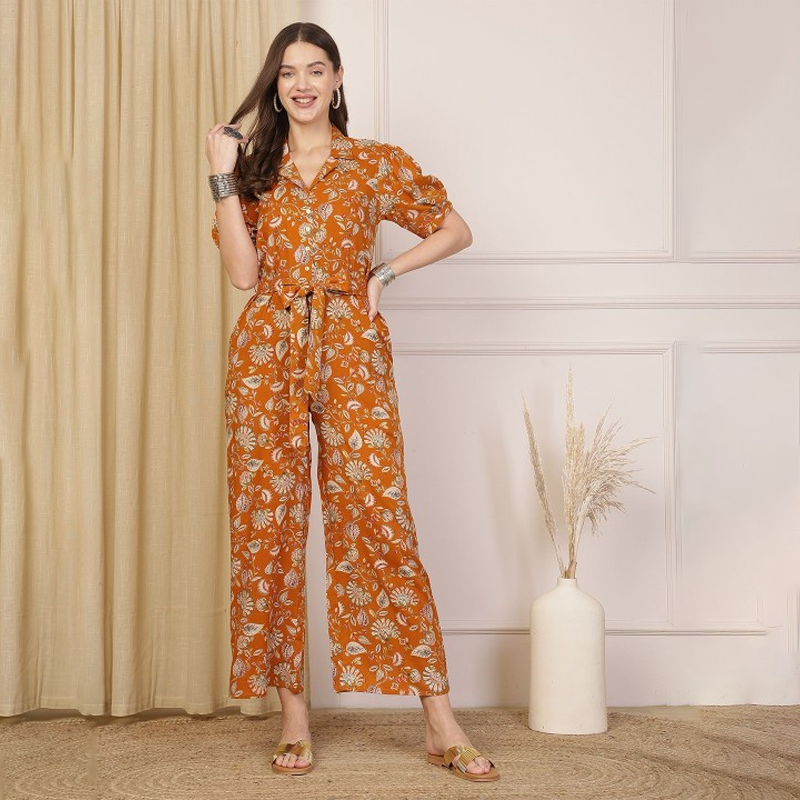 Orange & Green Floral Printed Front Tie Knot Playsuit