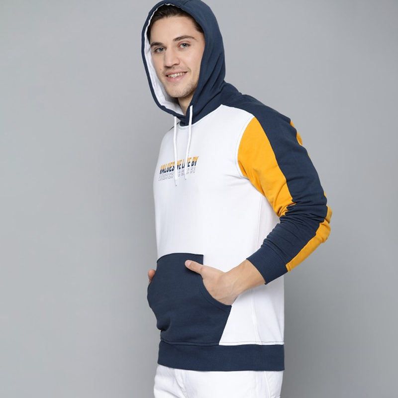 Men White & Navy Blue Colourblocked Hooded Sweatshirt